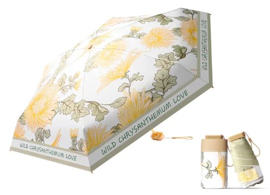 Mini dámsky skladací dáždnik s ochranou proti UV - Biely so žltými kvetmi a zelenými lístkami