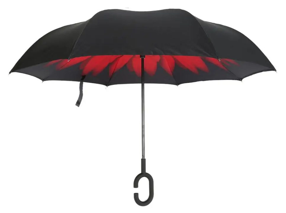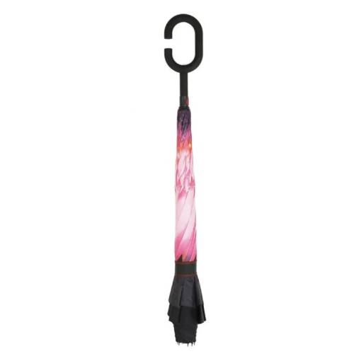 Obrátený dáždnik je vybavený ergonomickou rukoväťou vo tvare C, ktorá je vyrobená z gumy, čo zaisťuje pohodlný úchop bez nepríjemného tlaku na ruku.