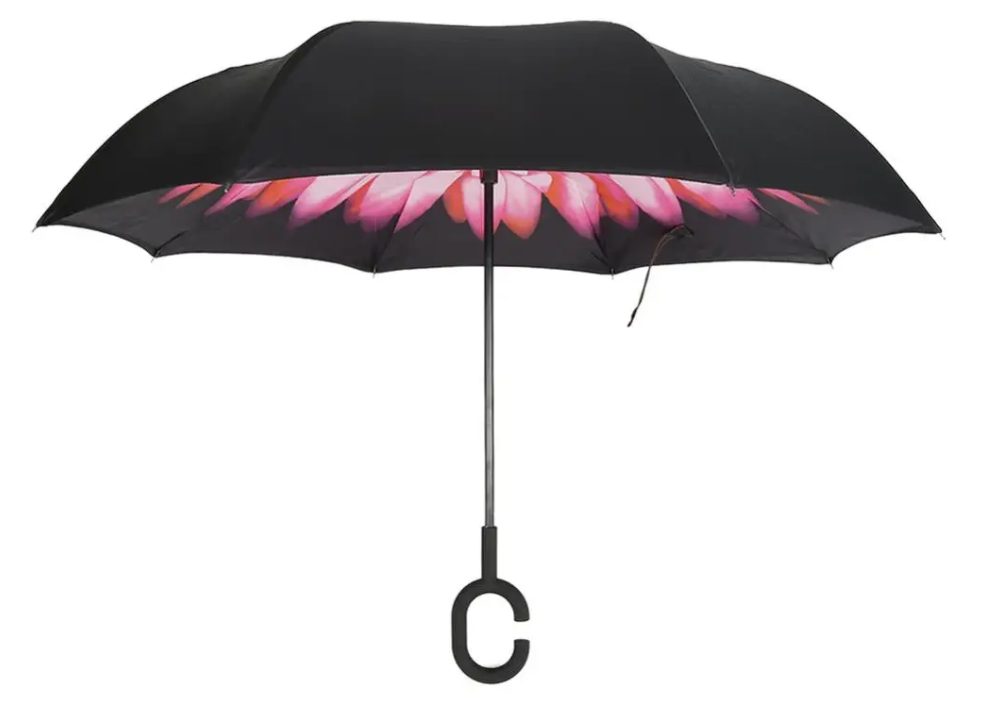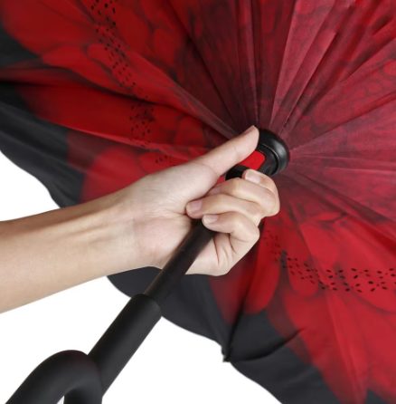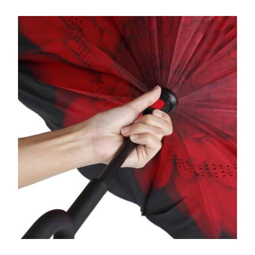 Obrátený dáždnik je vybavený ergonomickou rukoväťou vo tvare C, ktorá je vyrobená z gumy, čo zaisťuje pohodlný úchop bez nepríjemného tlaku na ruku.