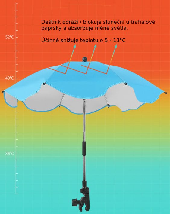 Dáždnik je navrhnutý s kompaktnými rozmermi, takže sa ľahko prenáša, a poskytuje dostatok tieňa. Je ideálny na použitie na pláži alebo pri upevnení na kočík.