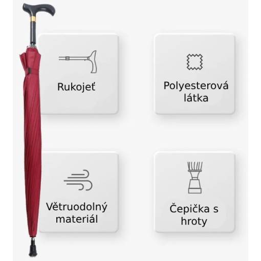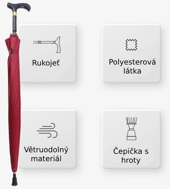 Dáždnik je ideálnou voľbou pre tých, ktorí potrebujú ako ochranu pred dažďom, tak spoľahlivú oporu pri chôdzi. Spája v sebe praktickú palicu a odolný dáždnik, čo Vám umožní mať oboch týchto pomocníkov neustále po ruke.